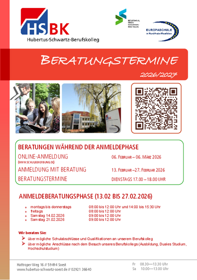 - Im Zeitraum vom 13. bis 27. Februar 2026 finden individuelle Anmeldeberatungen innerhalb der Öffnungszeiten unseres Berufskollegs statt.