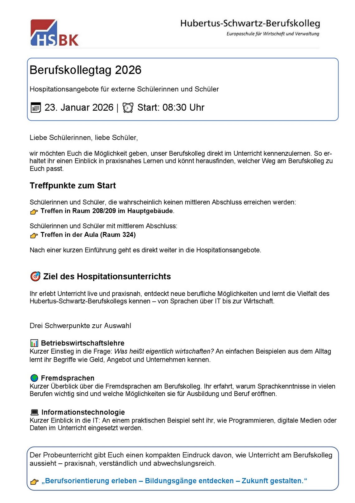 Das Schulleben am Berufskolleg wird insbesondere Schülerinnen und Schülern vorgestellt, die sich am Ende der Sekundarstufe I über schulische Anschlussmöglichkeiten informieren möchten. Nach einer Informationsveranstaltung über die Bildungsmöglichkeiten in der Aula des Hubertus-Schwartz-Berufskollegs (Beginn: 08:30 Uhr) besteht die Möglichkeit, am Probeunterricht teilzunehmen – insbesondere im Fach Betriebswirtschaftslehre. Darüber hinaus erhalten die Teilnehmenden Einblicke in den Fremdsprachen- sowie den Informationstechnologieunterricht. Im Anschluss an die Hospitationen können verschiedene Workshops besucht und Betriebspräsentationen besucht werden.