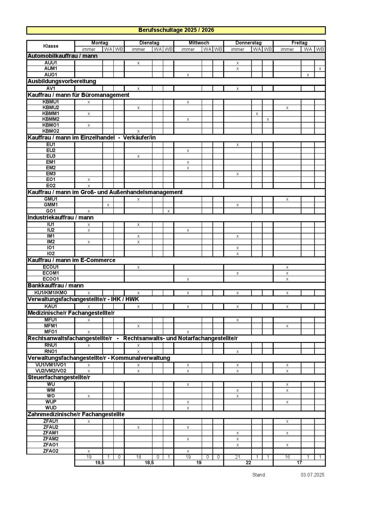 In dieser Übersicht finden Sie für die Berufsschulklassen die entsprechenden Berufsschultage.