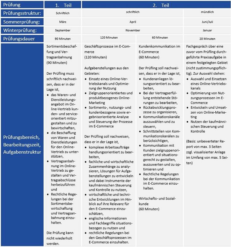 Die Kaufleute im E-Commerce absolvieren eine gestreckte Abschlussprüfung. Nach 18 Monaten der Ausbildung wird der Teil 1 der Abschlussprüfung über die ersten 15 Monate der Ausbildung durchgeführt. Teil 2 der Abschlussprüfung wird am Ende der Berufsausbildung absolviert.