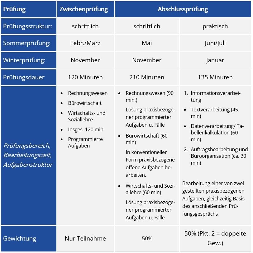 Nach ca. 15 Monaten findet eine computergestützte Prüfung mit Aufgaben zu den Inhalten „Informationstechnisches Büromanagement“ statt.
