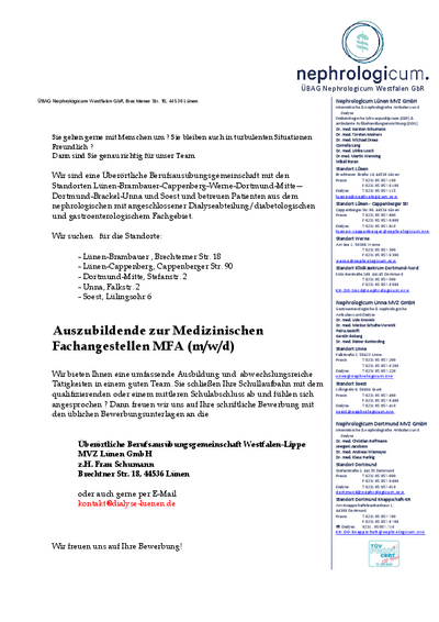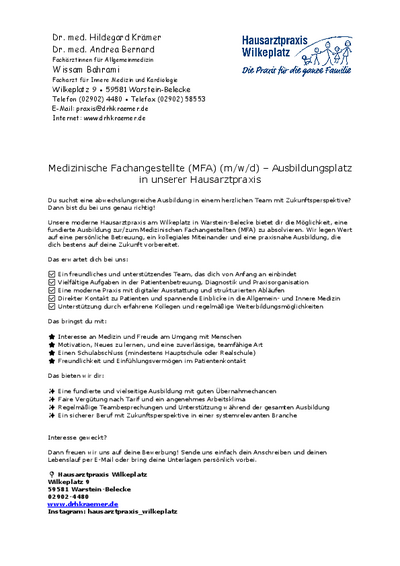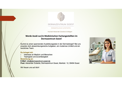 Für eine Ausbildungsstelle im Ausbildungsberuf 'Medizinsche/r Fachangestellte/r' benötigen Sie einen Ausbildungsvertrag mit einem ausbildenden Unternehmen. Für den Zugang zur Ausbildung bestehen formal keine Zugangsvoraussetzungen; die Ausbildung im dualen System steht grundsätzlich allen offen.