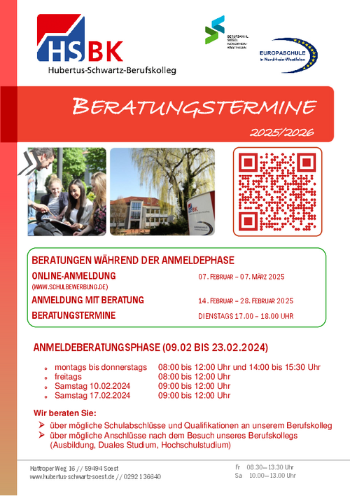 - Im Zeitraum vom 14. bis 28. Februar 2025 finden individuelle Anmeldeberatungen innerhalb der Öffnungszeiten unseres Berufskollegs statt.