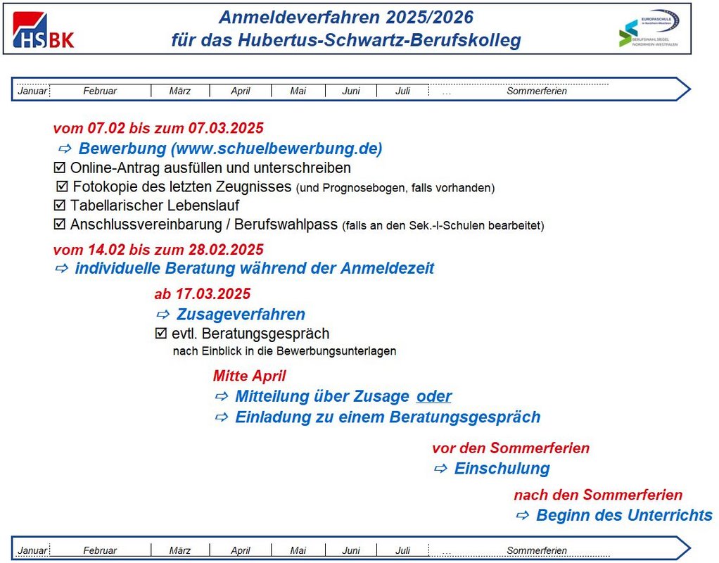 Die Anmeldung ist ein Antrag auf Aufnahme am Hubertus-Schwartz-Berufskolleg. Bitte beachten Sie, dass Sie sich zusätzlich persönlich mit Ihrem ausgedruckten Aufnahmeformular und den angegebenen Unterlagen im Berufskolleg vorstellen müssen.
