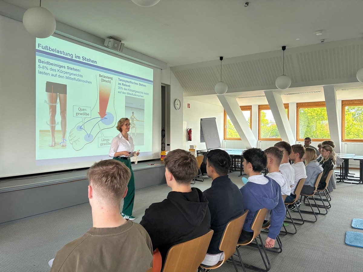 Am Montag gab es am Hubertus-Schwartz-Berufskolleg Soest einen ganz besonderen Auftakt zur Projektwoche mit dem NRW Juniorballett: Die renommierte Orthopädin Dr. Elisabeth Exner-Grave vom Kreis Soest war zu Gast und arbeitete mit unserer Fitness|PRO-Klasse zum Thema Fußgesundheit. In einem theoretischen Teil ging es um die Bedeutung gesunder Füße, ihre Anatomie und ihre zentrale Rolle für Haltung, Gleichgewicht und Mobilität – nicht nur im Tanz, sondern im Alltag.