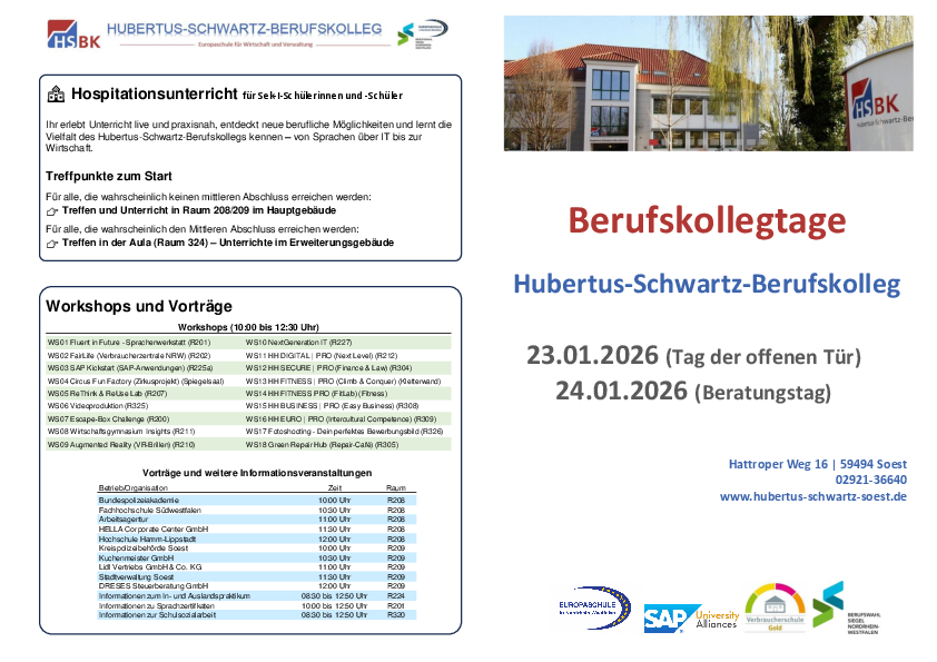 Am 23. und 24. Januar 2026 lädt das Hubertus‑Schwartz‑Berufskolleg zu den Berufskollegtagen ein und bietet interessierten Schülerinnen und Schülern die Möglichkeit, das breite Bildungsangebot der Schule kennenzulernen und erste Eindrücke vom Unterricht zu gewinnen.
