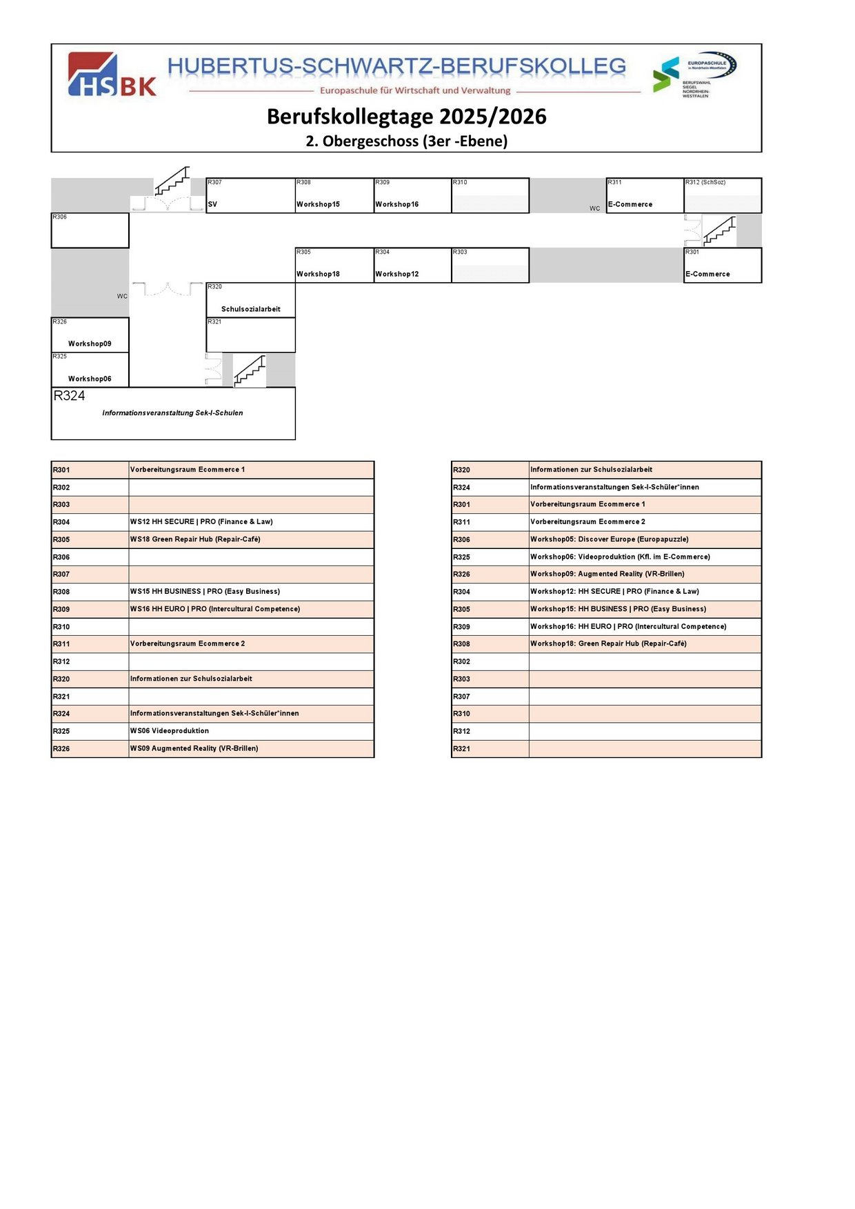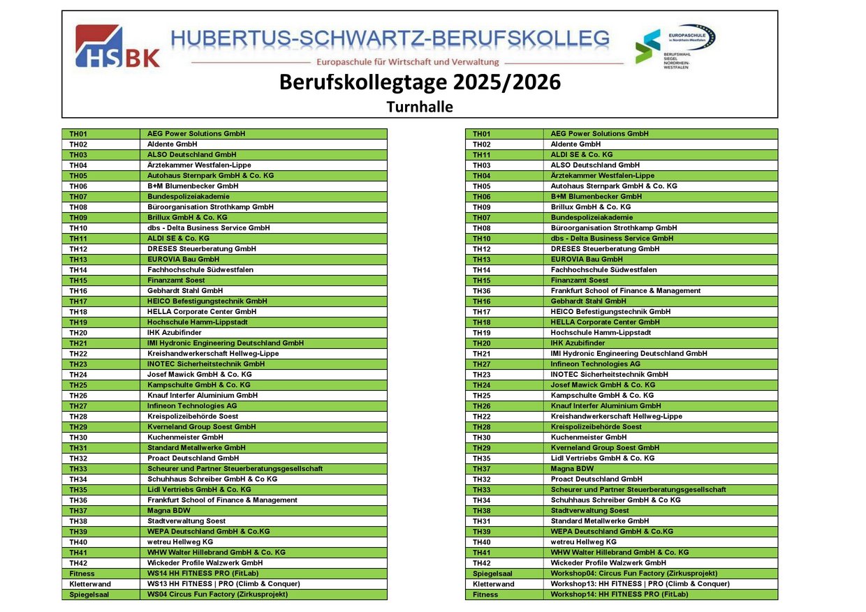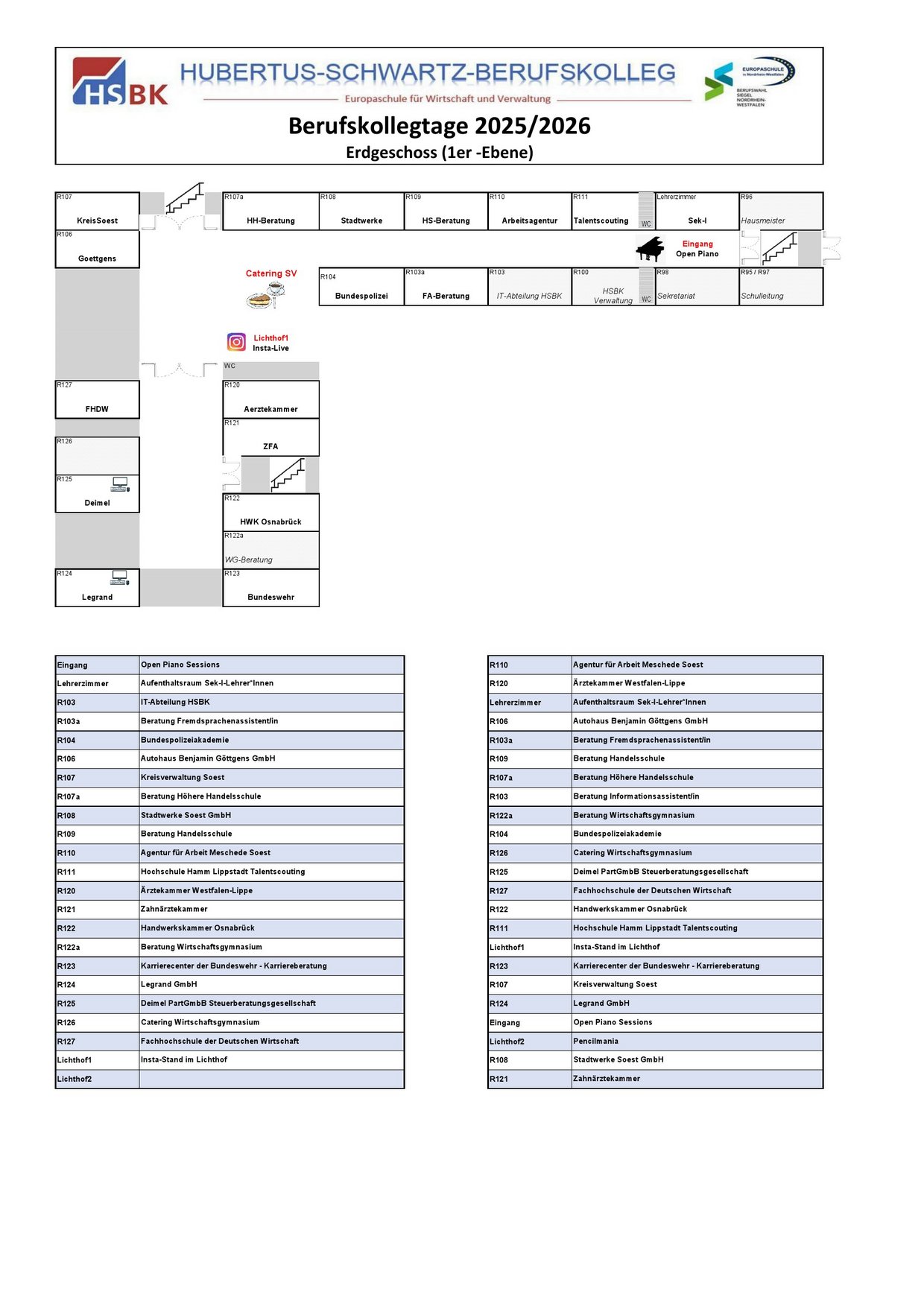 Darüber hinaus stellen anwesende Ausbildungsbetriebe die Berufe vor, für die das Hubertus‑Schwartz‑Berufskolleg als Berufsschule zuständig ist. Hochschulen, Weiterbildungseinrichtungen und Behörden aus der Region präsentieren sich ebenfalls und zeigten das breite Spektrum an Bildungs‑ und Entwicklungsmöglichkeiten. Ergänzend finden interne und externe Vorträge statt, die detaillierte Einblicke in schulische und berufliche Perspektiven bieten.