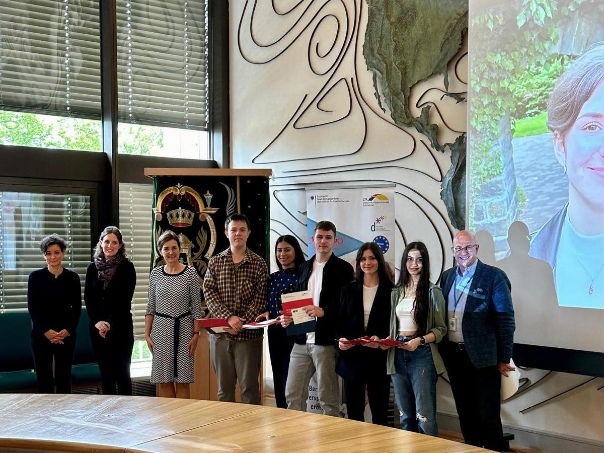 Auf dem Programm standen eine Gruppenbegleitung im „Haus der Geschichte“, ein offizieller Empfang durch die Leiterin der Zentralstelle für das Auslandsschulwesen, Frau Heike Toledo, im „Weltsaal“ des Auswärtigen Amts mit Urkunden- und Preisverleihung sowie ein gemeinsamer Ausklang in einem Restaurant am Rheinufer.