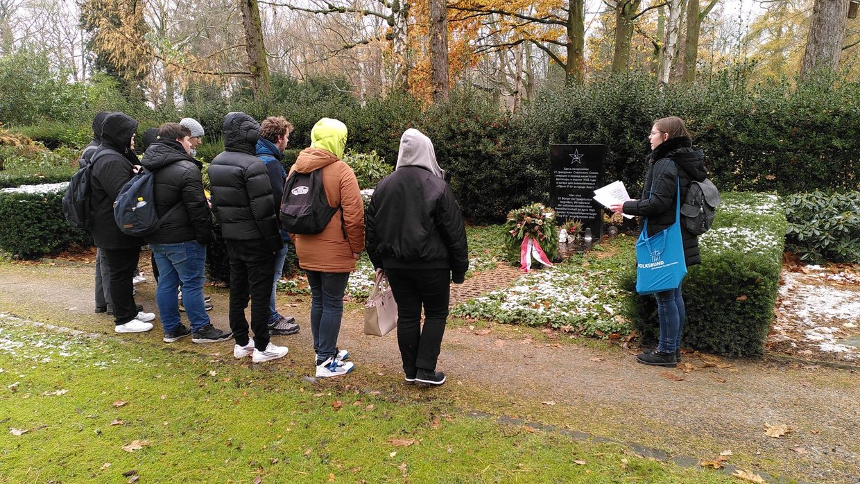 Trotz der widrigen Wetterumstände hat Frau Schmolke es geschafft, das Interesse der Schülerinnen und Schüler mit ihren anschaulichen Erläuterungen vor Ort aufrecht zu halten. In einer abschließenden Diskussion vor Ort, die im Unterricht fortgeführt wird, tauschten sich die Anwesenden über die Gedenkstättenarbeit und die Arbeit des Volksbunds als Bestandteile zur Sicherung des Friedens aus.