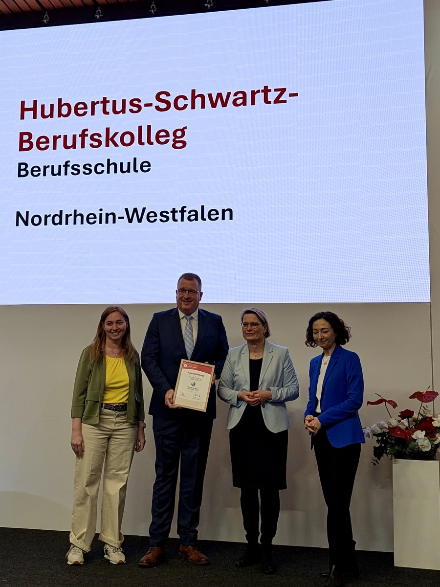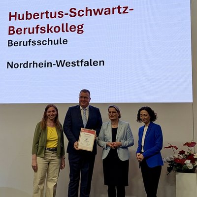 Das Hubertus-Schwartz-Berufskolleg konnte durch sein besonderes Engagement auf allen Ebenen der Verbraucherbildung nun die höchste Auszeichnungsstufe „Gold“ erreichen. Der Schulleiter Hubertus Gosmann nahm mit Simone Schmits die Auszeichnung von der Justizministerin Dr. Stefanie Hubig und der Vorständin des vzbv Ramona Pop in Berlin entgegen.