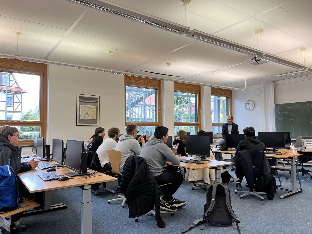 Am 24. Oktober 2023 war Florian Krampe, Ausbildungsmanager des AzubiFinder-Teams der IHK Arnsberg zu Gast bei den Abschlussjahrgängen der Kaufmännischen Assistentenbildungsgänge (Fremdsprachen und Informationsverarbeitung). Anhand von Praxisbeispielen wurde der gesamte Ablauf eines Bewerbungsverfahrens um Ausbildungsplätze und Duale Studiengänge thematisiert. Gemeinsam mit den Schülerinnen und Schülern konnten konkrete Hinweise auf die Bewerbung mit Lebenslauf, Einstellungstests, Assessment-Center und Vorstellungsgespräche gegeben und durch fundierte Praxisbeispiele erarbeitet werden.