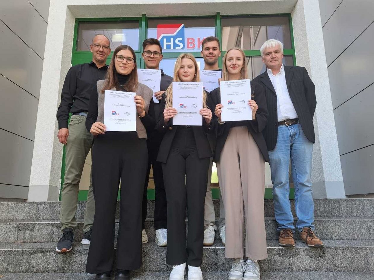 Erstmalig nahmen angehende Bankkaufleute des Hubertus-Schwartz-Berufskollegs an der KMK-Sprachprüfung Englisch für Wirtschaft und Verwaltung der Stufe B2 teil. Die Prüfung bestand aus drei schriftlichen (Rezeption –Texten und gesprochenen Mitteilungen Informationen entnehmen-, Produktion -Schriftstücke erstellen- und Mediation -Vermitteln in zweisprachigen Situationen/ Texte wiedergeben-) und einem mündlichen Teil (Interaktion -Gespräche führen-). Gut vorbereitet von Fachlehrer Klaus Bork waren alle teilnehmenden Auszubildenden der Volksbank Hellweg eG und Sparkasse Hellweg-Lippe erfolgreich und konnten ihre Urkunden von Bildungsgangleiter Michael Müntefering entgegen nehmen.