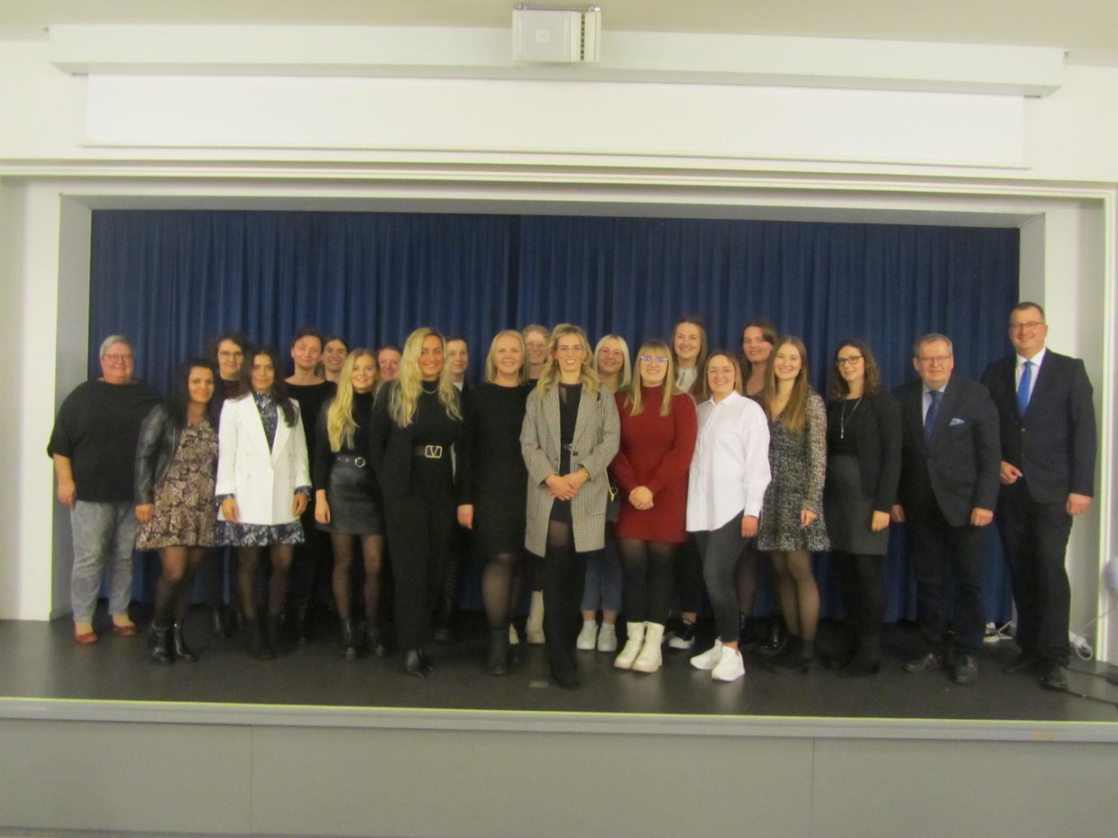 Nach 300 Stunden Unterricht in 8 Teilmodulen; u. a. Qualitätsmanagement; Lern- und Arbeitsmethodik, Teamführung, BWL, Arbeitssicherheit und Gesundheitsschutz, Einsatz von Informations- und Kommunikationstechnologie und Notfallmanagement haben nunmehr 22 Teilnehmerinnen ihr Ziel, ihre Weiterbildung zur „Fachwirtin für ambulante Versorgung“ an unserem Berufskolleg mit Erfolg beendet. Im Beisein von Praxisinhabern/-innen, Kolleginnen und Kollegen und Verwandten und Freunden konnten sie in der Aula Zeugnis und Fachwirtinnenbrief frohgestimmt und glücklich entgegennehmen. In ihren Ansprachen betonten der stellvertretende Schulleiter Hubertus Gosmann, die Vorsitzende des Prüfungsausschusses Birgitta Gerke und Kursleiter Klaus Laufkötter die Bedeutung der Ausbildung in der heutigen Zeit. Ziel der Maßnahme ist es, die Teilnehmerinnen dahingehend zu qualifizieren, dass sie die Praxisinhaber entscheidend von ihren administrativen entlasten, damit diese sich noch intensiver den Patienten zuwenden können. Dieses ist insofern notwendig, da die Anforderungen an eine hoch qualifizierte Praxis, aus welcher Richtung auch immer, komplexer und anspruchsvoller werden. Für diese Anforderungen sind die examinierten „Fachwirtinnen für ambulante Versorgung“ nun gut gerüstet.