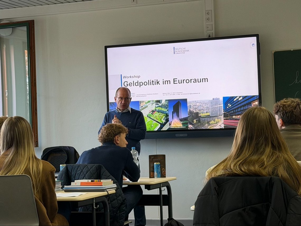 Herr Zimmermann, zuständig für die Öffentlichkeitsarbeit der Deutschen Bundesbank (Hauptverwaltung in Nordrhein-Westfalen), besucht das HSBK bereits seit vielen Jahren jährlich, um diesen Workshop für die jeweilige Oberstufenklasse durchzuführen.