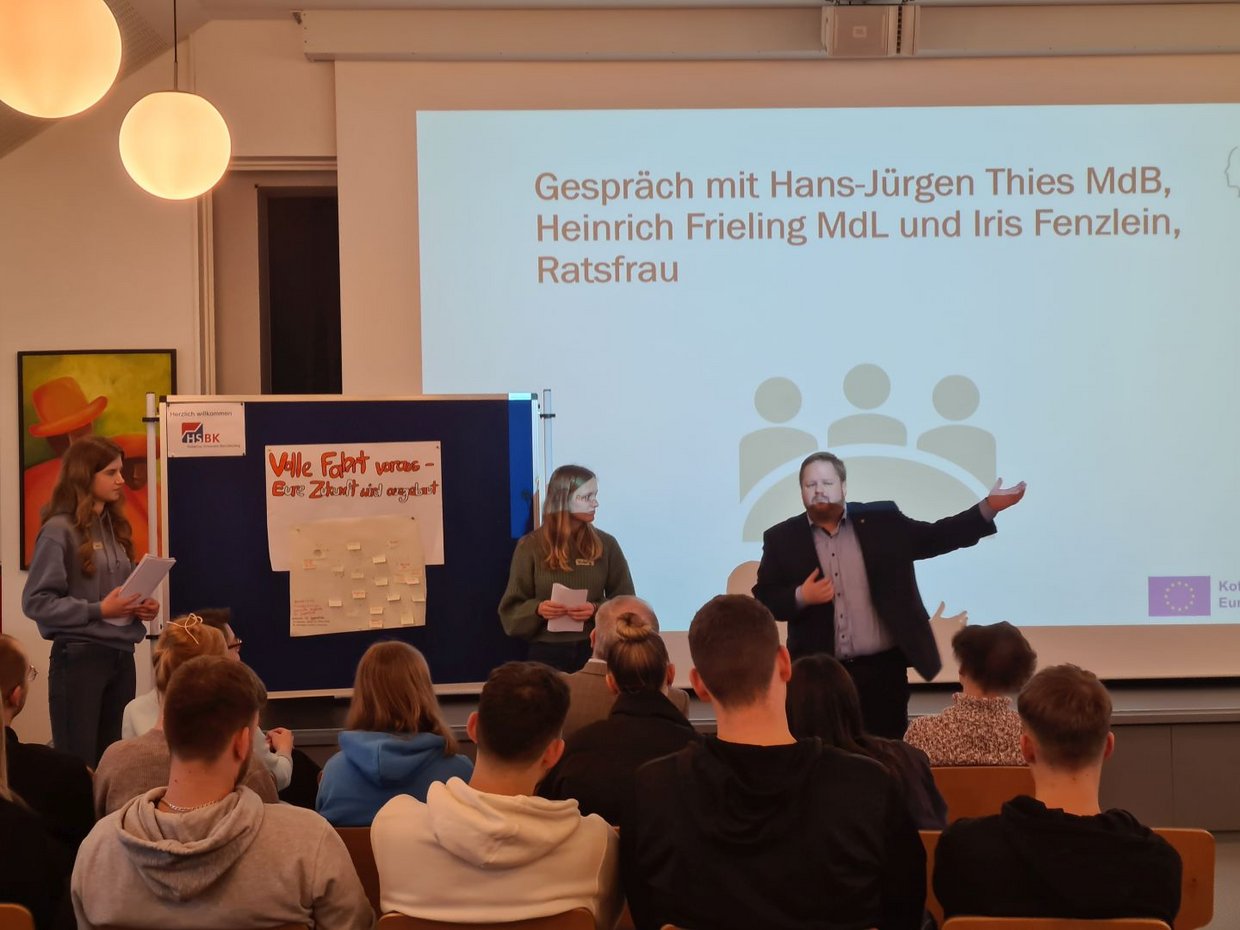 Für die angehenden Industriekaufleute ergab sich noch ein weiterer Mehrwert. Denn Lukas Balke und Marc Stange stellten immer wieder inhaltliche Bezüge zum Berufsschulunterricht her, indem sie auf ökologische Unternehmensziele, das Bruttoinlandsprodukt, Währungsrisiken oder die Europäische Zentralbank eingingen. Wie ein roter Faden zog sich auch die private Verflechtung jedes einzelnen Auszubildenden mit der EU durch die Veranstaltung (z. B. EU als potentieller Arbeitsmarkt oder als Reiseziel mit einheitlicher Währung sowie als Sicherheitsgarant in unsicheren Zeiten). „Europa ist für Deutschland eine wichtige Zukunftsoption. Unsere Schülerinnen und Schüler sind europäische Bürger und sollten den europäischen Arbeitsmarkt immer im Blick haben“ , betonte der stellvertretende Schulleiter Hubertus Gosmann am Rande der Veranstaltung.