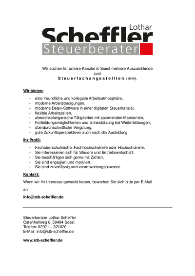 | Lothar Scheffler | Westenhellweg 5 | 59494 Soest | https://www.stb-scheffler.de |