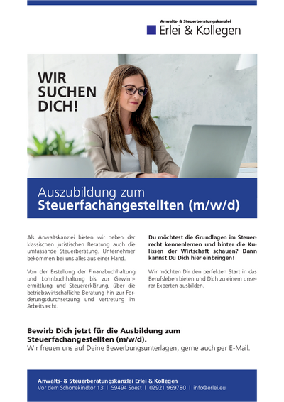 | Anwalts- und Steuerberatungskanzlei Erlei & Kollegen | Vor dem Schonekindtor 13 | 59494 Soest | https://www.kanzlei-erlei.de |