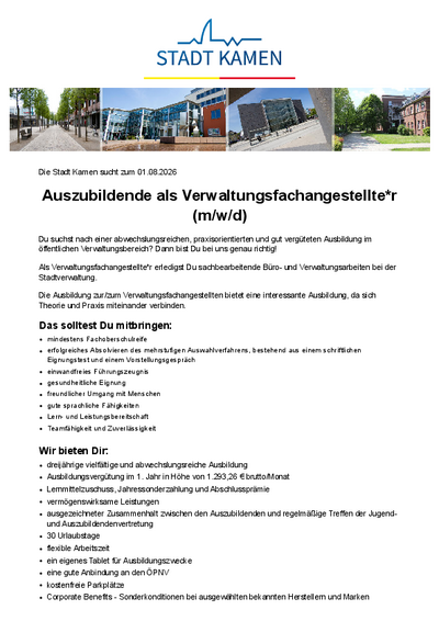 Mitbringen sollte eine Auszubildende / ein Auszubildender ebenso die Bereitschaft zum selbstständigen Arbeiten und persönliche Zuverlässigkeit. Auszubildende, welche dementsprechend aufgeschlossen und kooperativ sowohl im Umgang mit Bürgern, Unternehmen und sonstigen Organisationen als auch im Hinblick auf Mitarbeiter und Vorgesetzte sind, haben nach Abschluss ihrer dualen Berufsausbildung zum/zur Verwaltungsfachangestellten gute Chancen und aussichtsreiche Aufstiegsmöglichkeiten in der öffentlichen Verwaltung.